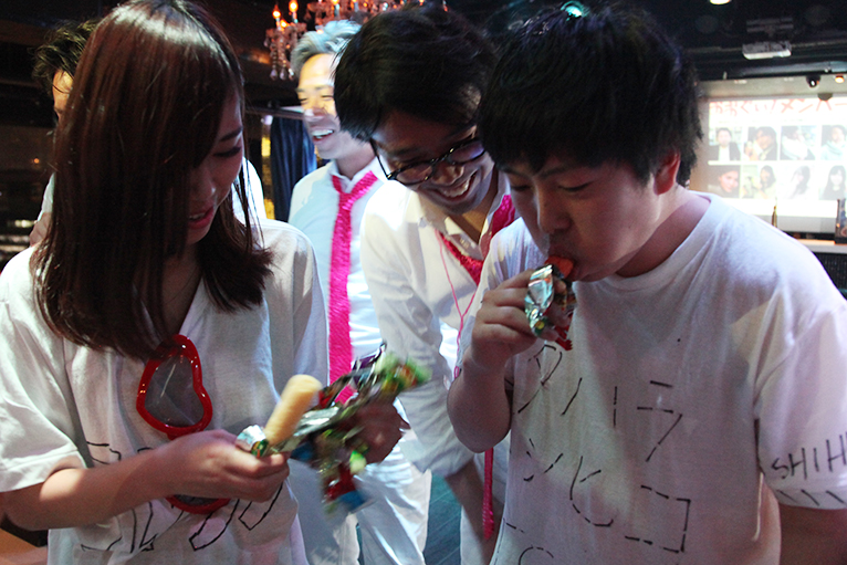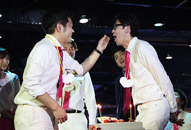 4月誕生月のメンバーのお祝い。お決まりのファーストバイトの瞬間! 誰が誰にファーストバイトをお願いするか、毎回少し楽しみです♪