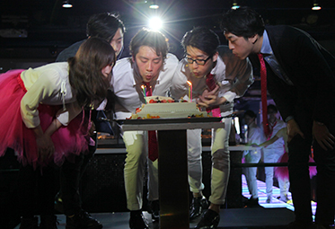 4月誕生月のメンバーのお祝い。お決まりのファーストバイトの瞬間! 誰が誰にファーストバイトをお願いするか、毎回少し楽しみです♪
