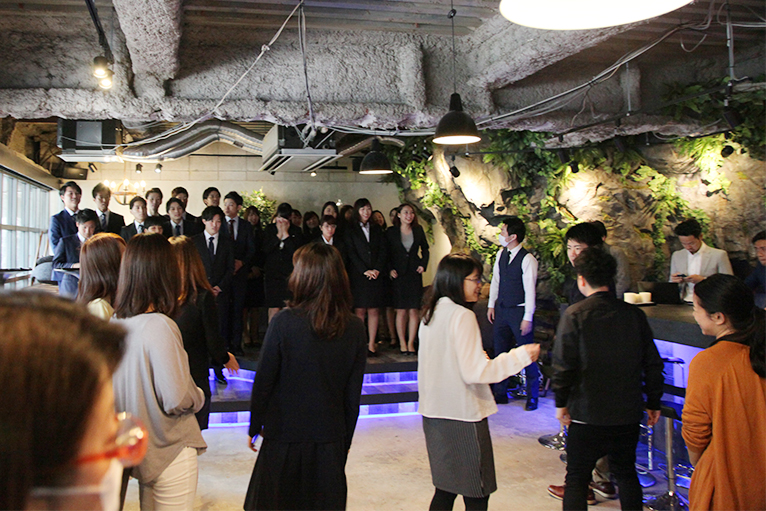 壇上に新卒がずらり。対して下には既存社員がずらり。
