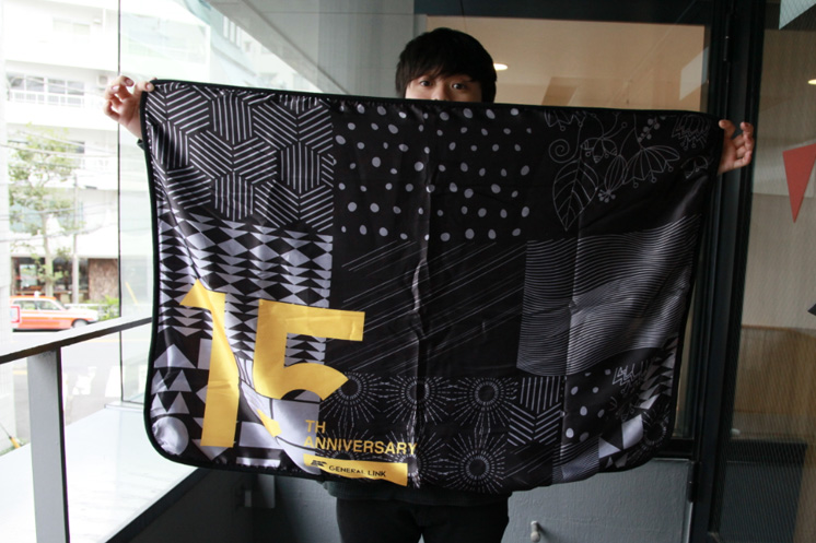 2つめは、社員デザインの厚手ブランケットです。このデザインは、わたしたちが大事にしている、コアバリューを表した柄が全面プリントされてます。