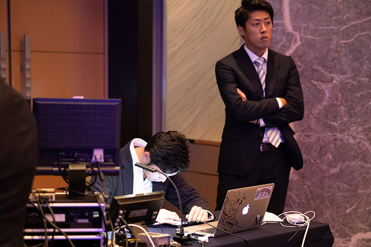 音響や映像、司会のリハなども進行していきます。普段の業務を終えてから行うので、1時間程度の短い時間でテキパキこなします。