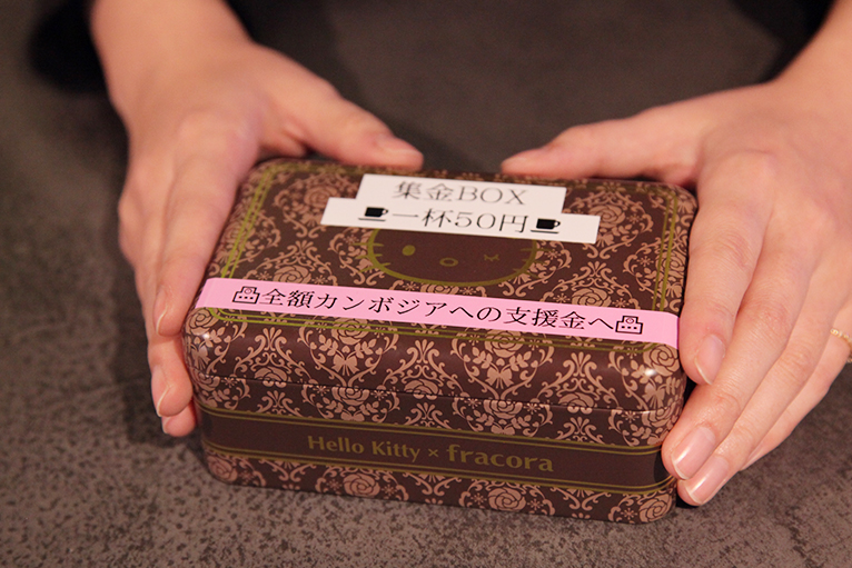 飲むときにお金を入れる募金箱。集まったお金はカンボジアへ募金されるシステムです。